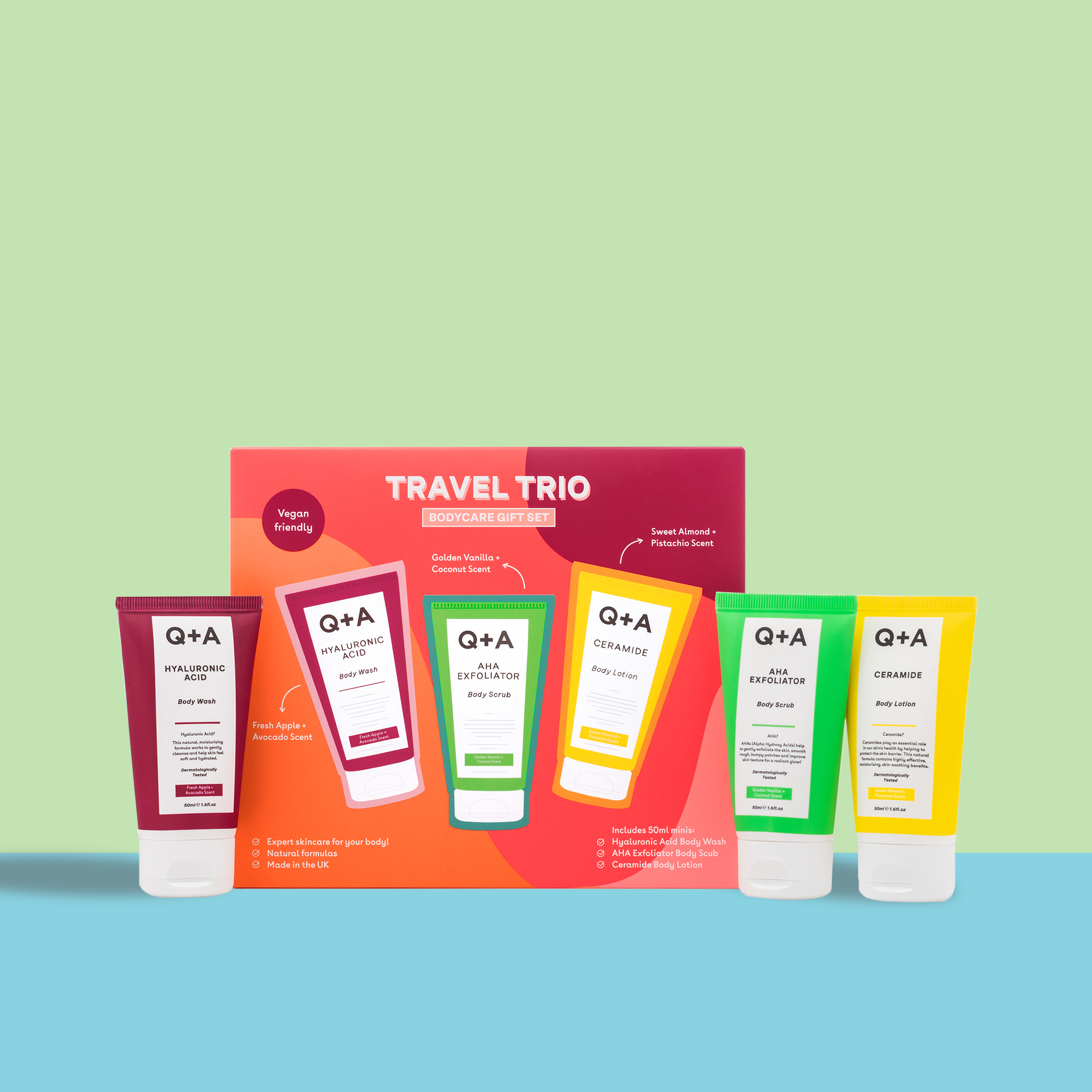 Q+A Travel Trio Bodycare Gift Set Front of Box