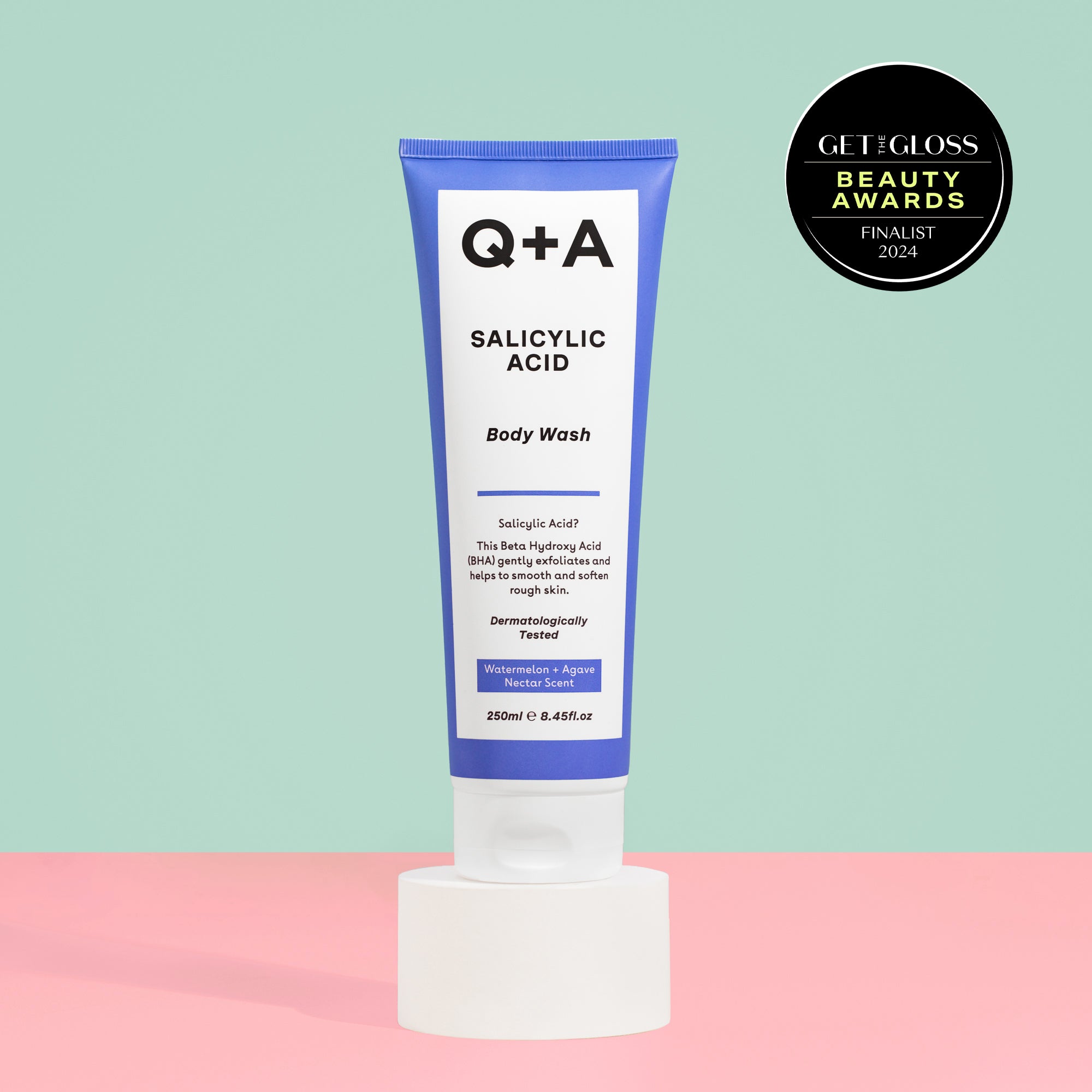 Q+A Salicylic Acid Body Wash with ingredients on a pink background
