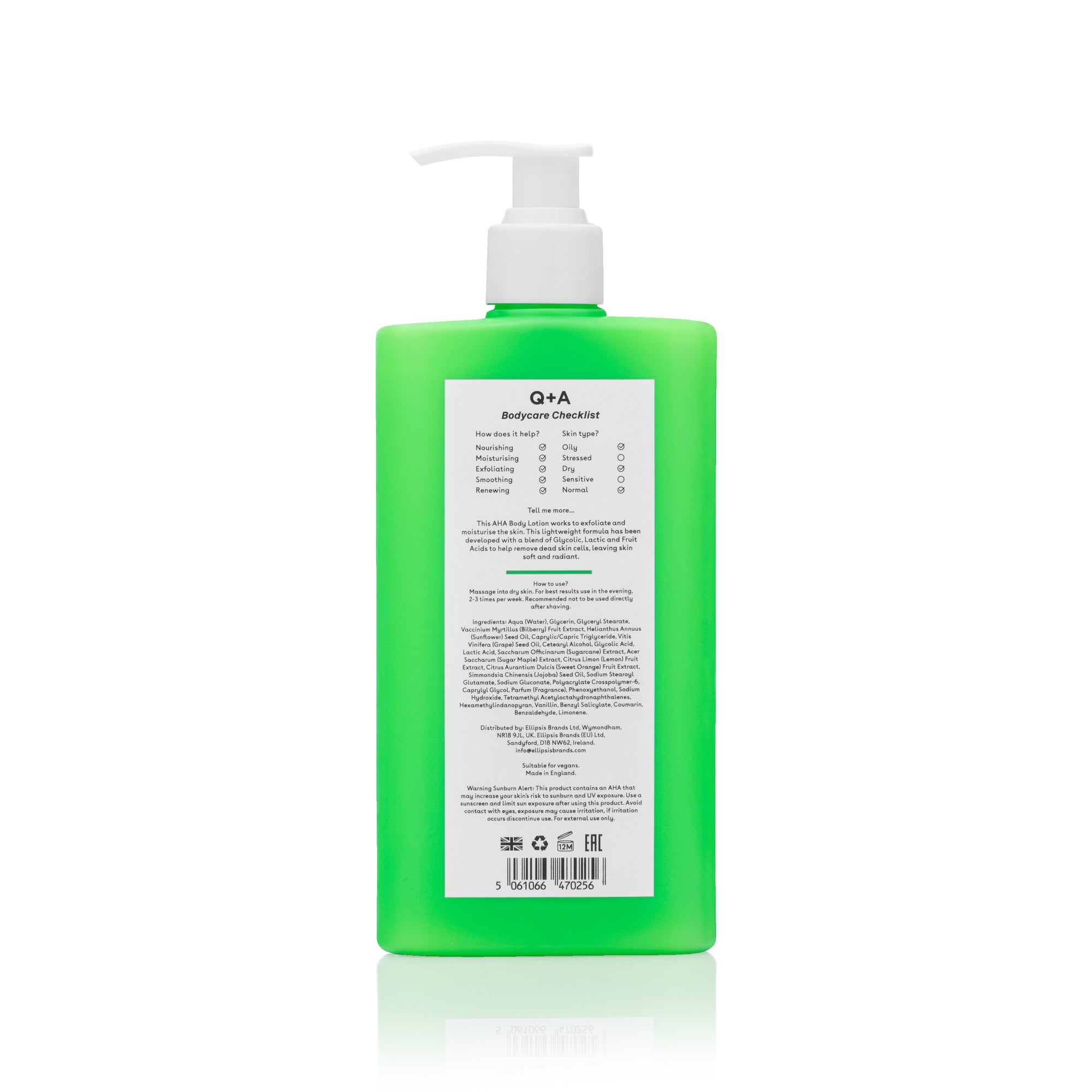 Q+A AHA Exfoliator body lotion with ingredients highlighted on a light green background