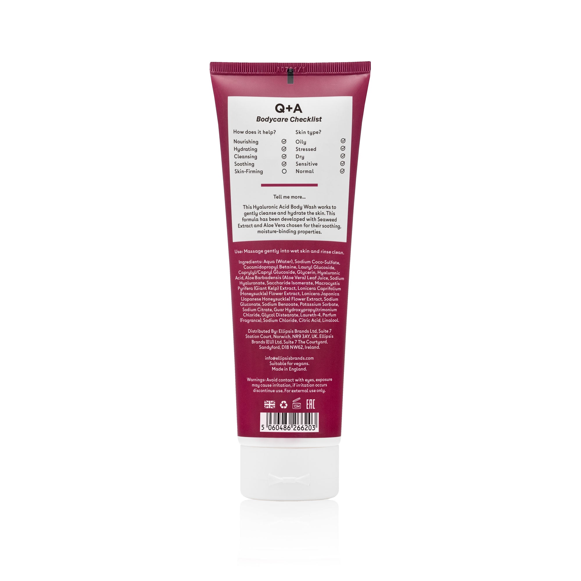 Q+A Hyaluronic Acid Body Wash with features listed on a pink background