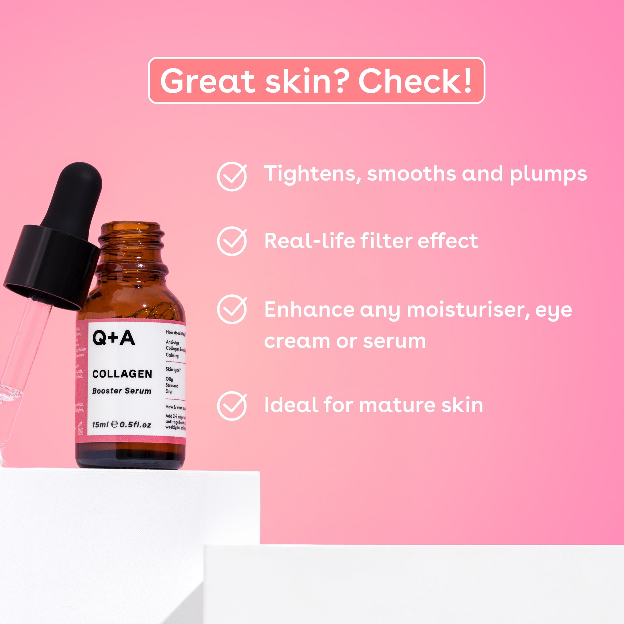This highly concentrated, vegan-friendly serum contains a blend of vegetable Collagen, Honey Locust Seed and Algae Extracts that help tighten, smooth, and plump the skin for a real-life filter effect. Ideal for mature skin or those converting to an anti-ageing regime, it’s the perfect way to enhance any moisturiser, eye cream or serum!*