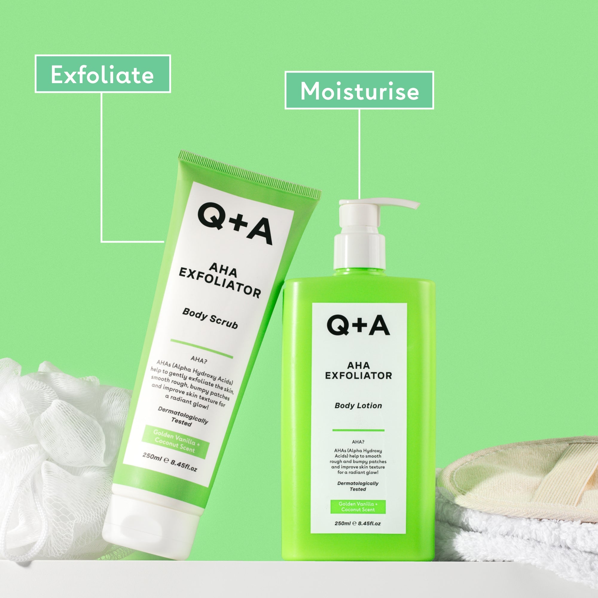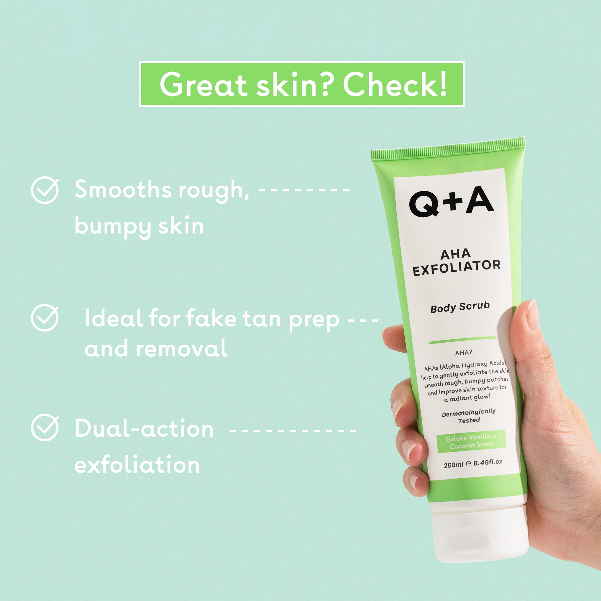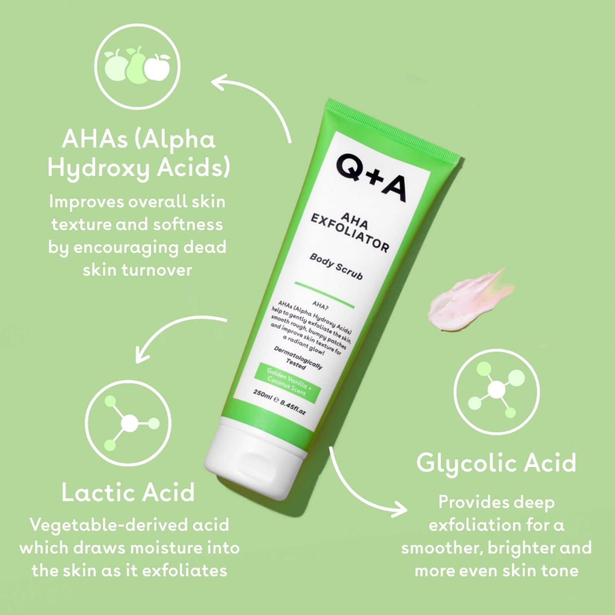 Q+A AHA Exfoliator body scrub held in a hand with product features on a light green background