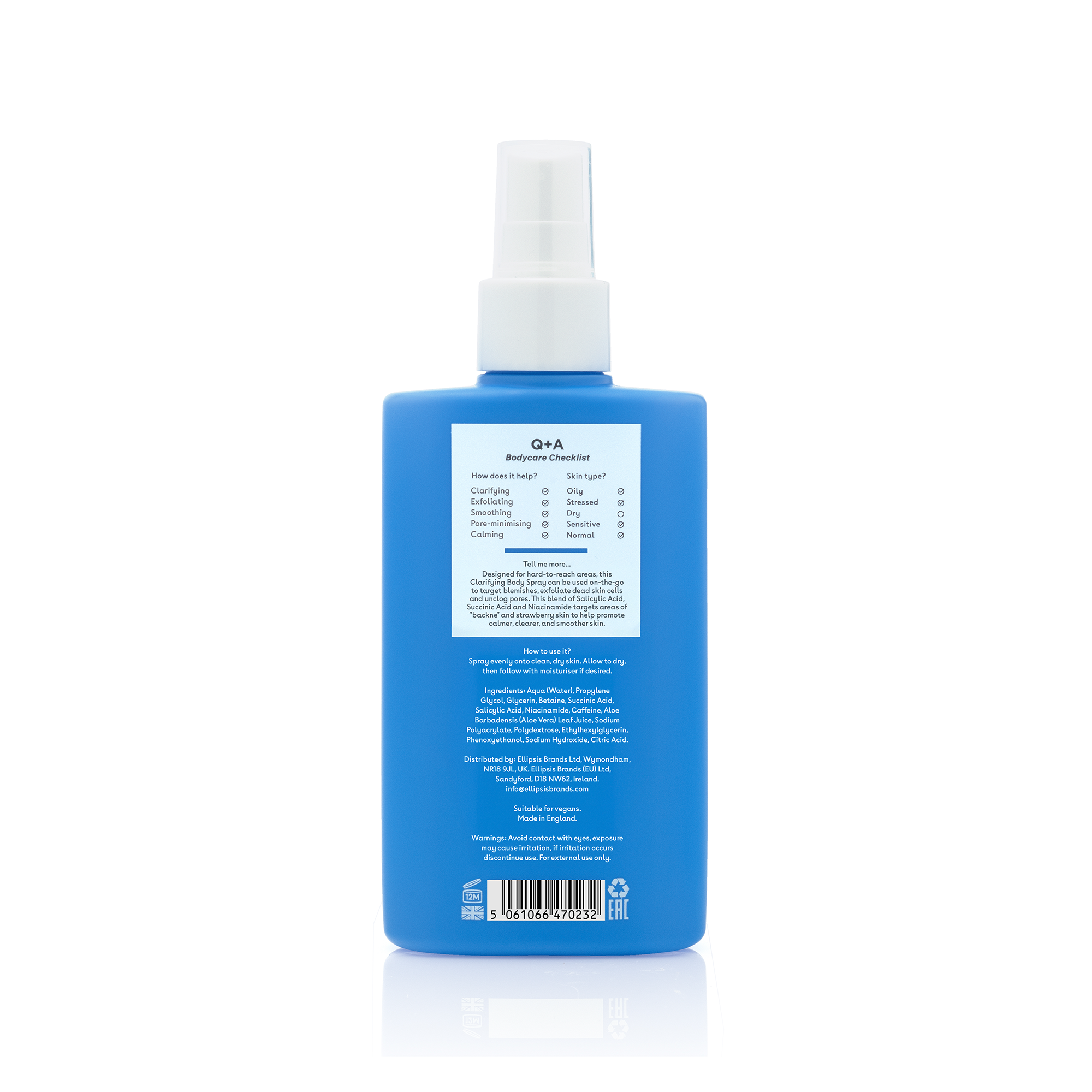 How do I use the Salicylic Acid Clarifying Body Spray? Spray evenly over the affected area. Apply to clean, dry skin and allow to absorb fully before dressing. Follow with a moisturiser if desired. Use daily for best results.