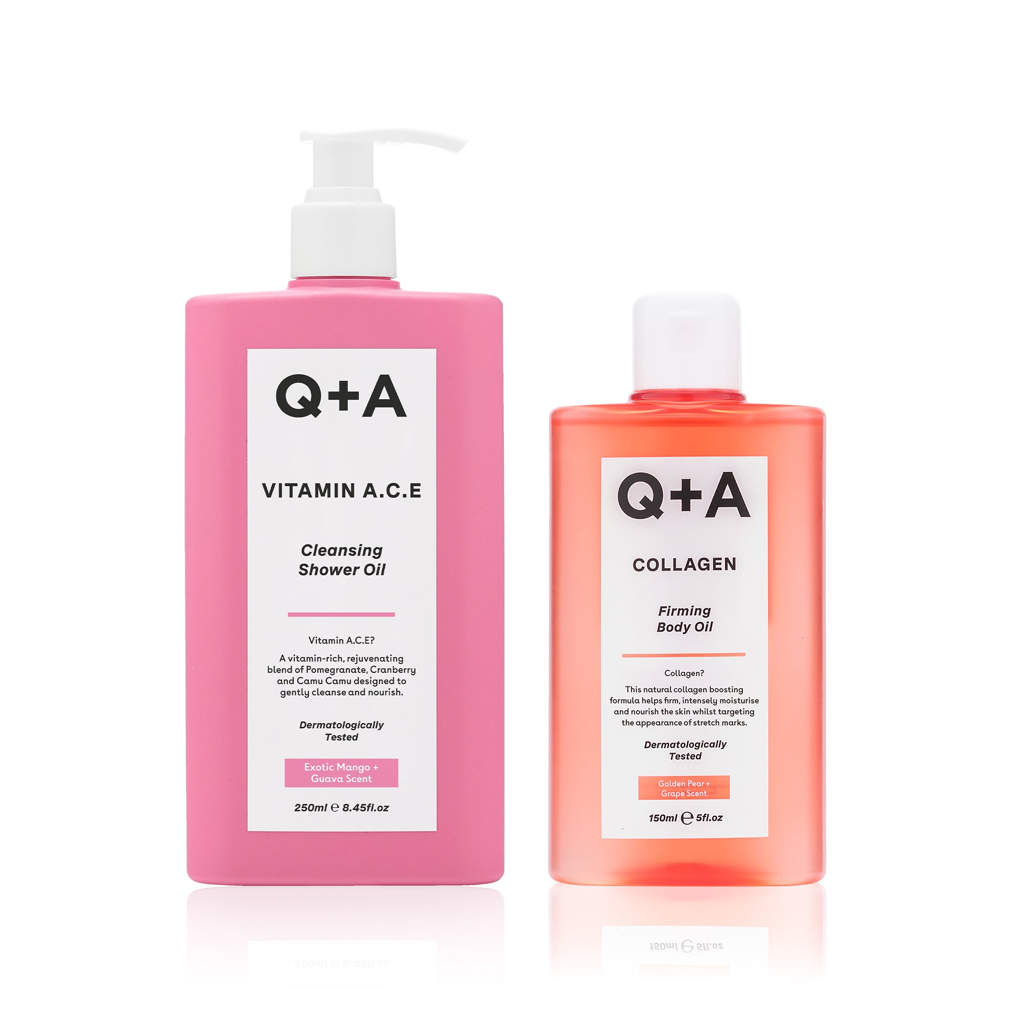 Vitamin A.C.E Cleansing Shower Oil: Aqua (Water), Glycerin, Cocamidopropyl Betaine, Caprylyl/Capryl Glucoside, Sodium Coco-Sulfate, Decyl Glucoside, Coco-Glucoside, Glyceryl Oleate, Hippophae Rhamnoides (Sea Buckthorn) Fruit Oil, Punica Granatum (Pomegranate) Seed Oil, Tocopherol, Vaccinium Macrocarpon (Cranberry) Fruit Extract, Malpighia Emarginata (Acerola Cherry) Fruit Extract, Myrciaria Dubia (Camu Camu) Fruit Extract, Hippophae Rhamnoides (Sea Buckthorn) Fruit Extract, Paullinia Cupana (Guarana) Fruit Extract, Olea Europaea (Olive) Fruit Oil, Dunaliella Salina (Algae) Extract, Simmondsia Chinensis (Jojoba) Seed Oil, Helianthus Annuus (Sunflower) Seed Oil, Sodium Benzoate, Potassium Sorbate, Ascorbyl Palmitate, Citric Acid, Parfum (Fragrance), Linalool, Limonene, Benzyl Alcohol.