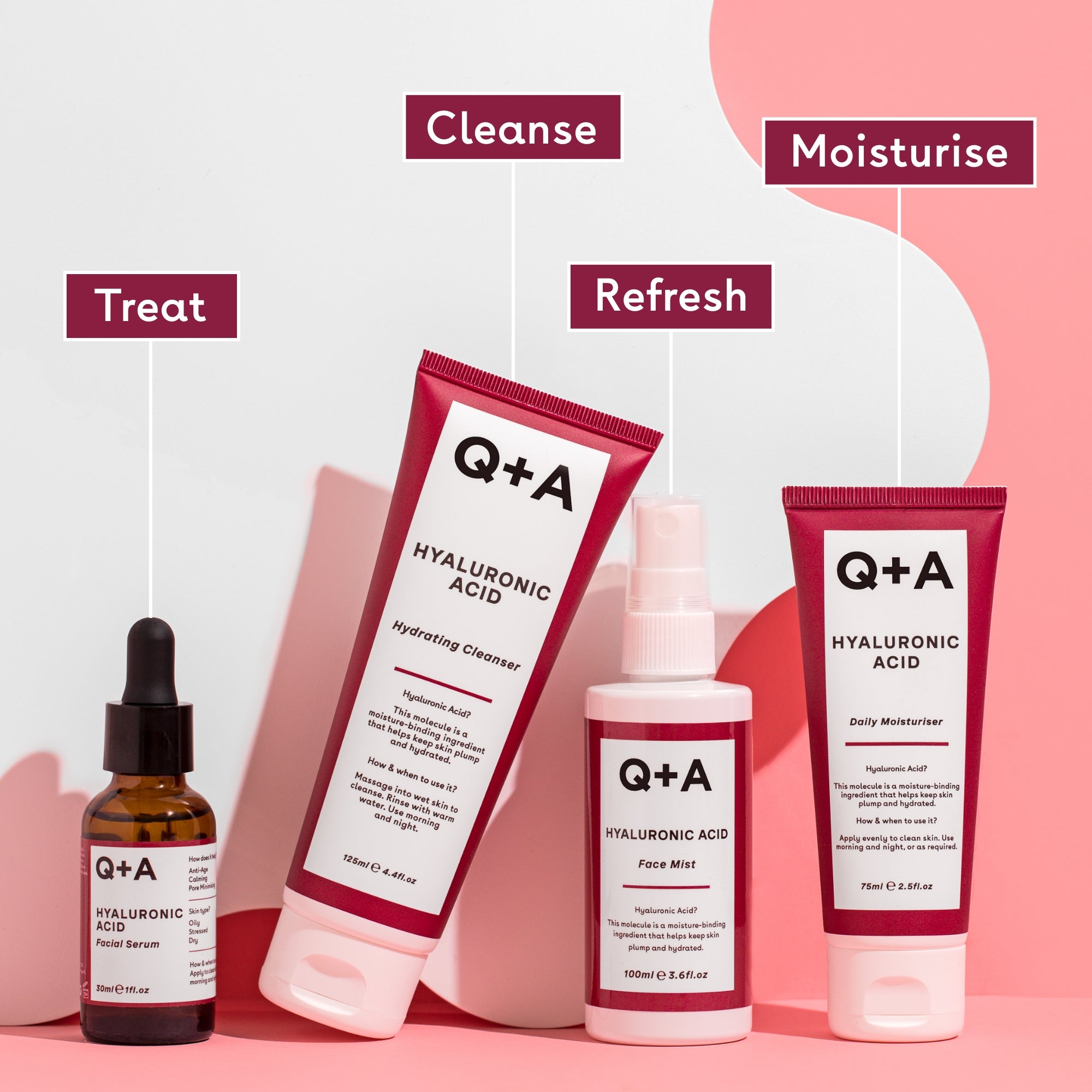Q+A Hyaluronic range with treat, cleanse, refresh and moisturise labels