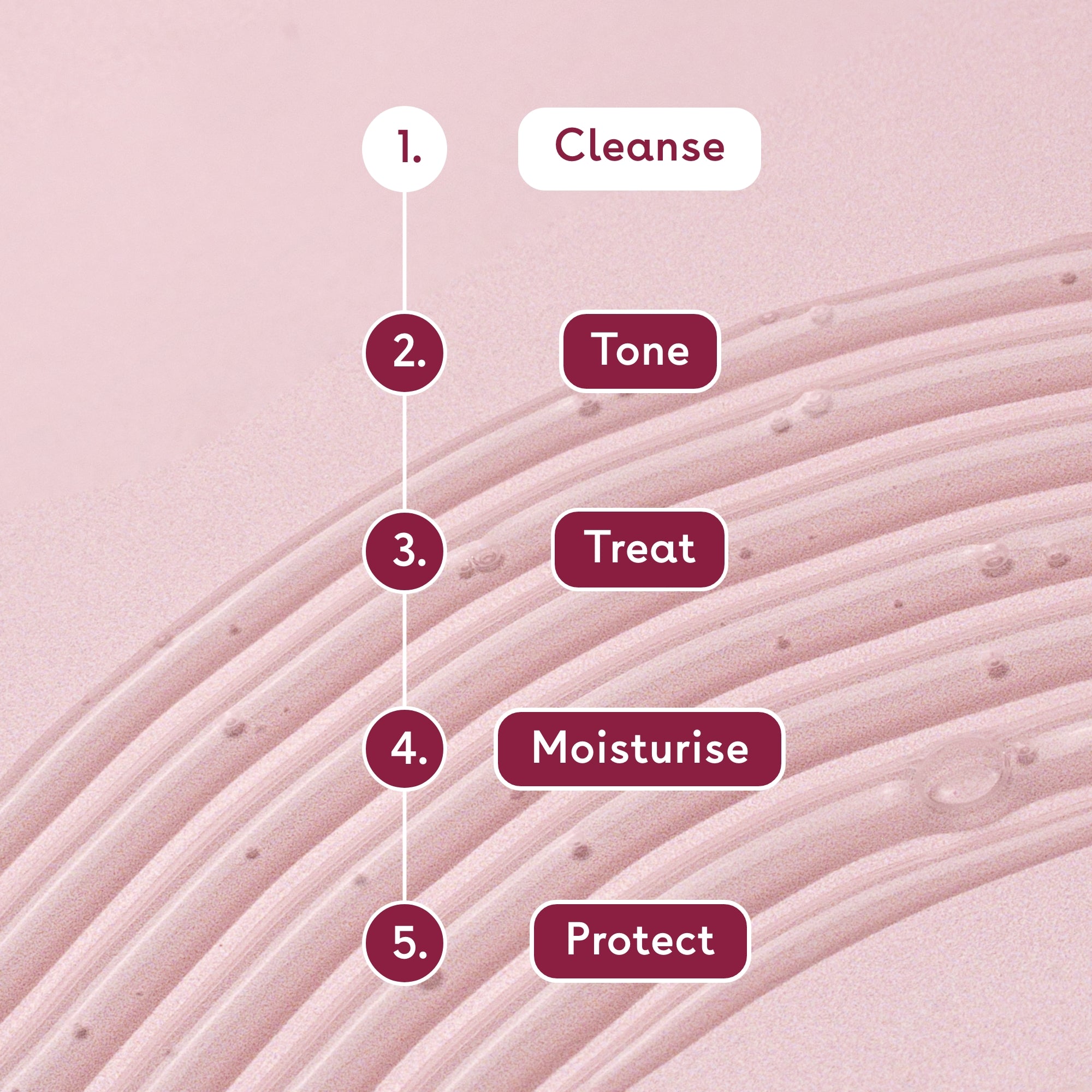 Q+A skincare steps cleanse, tone, treat, moisturise and protect labels