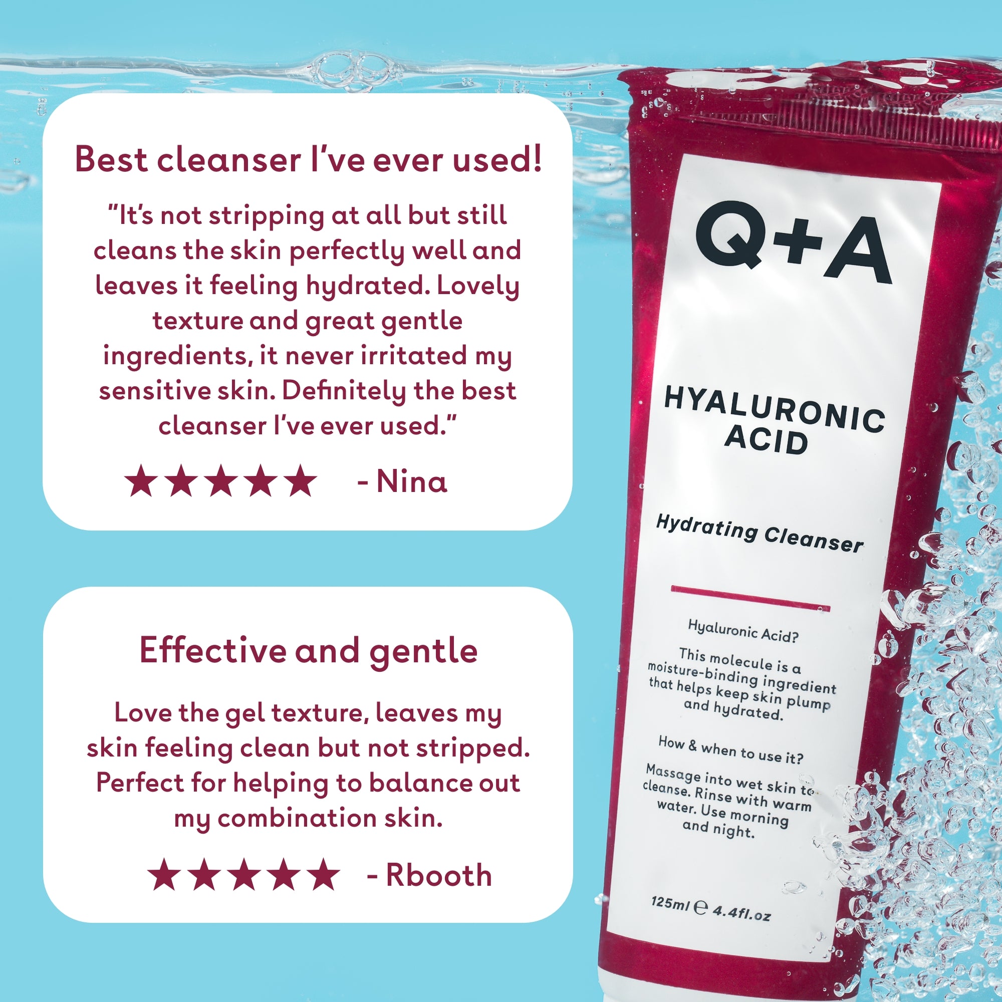 Q+A Hyaluronic Acid cleanser customer reviews on blue background
