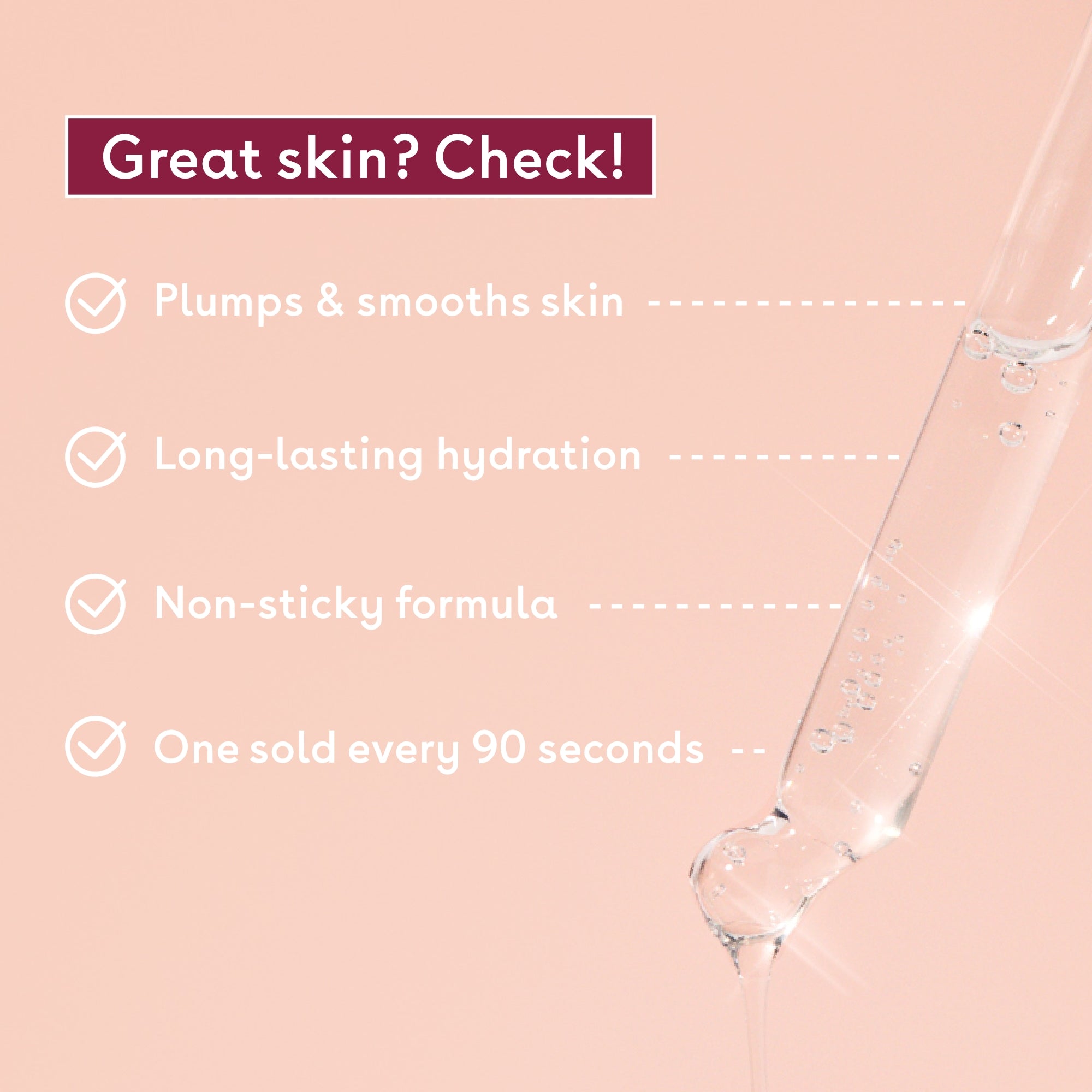 Hyaluronic Acid is a super hydrator. Don’t let the word “acid” scare you: we produce it naturally in our own bodies too! Enhanced by a range of natural ingredients, this serum will quench even the thirstiest skin.